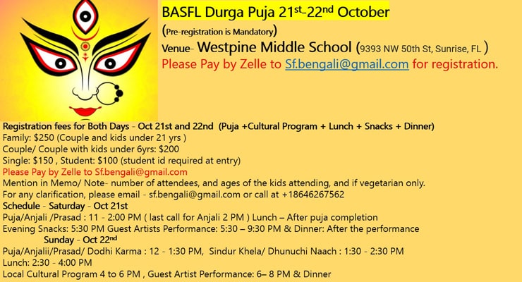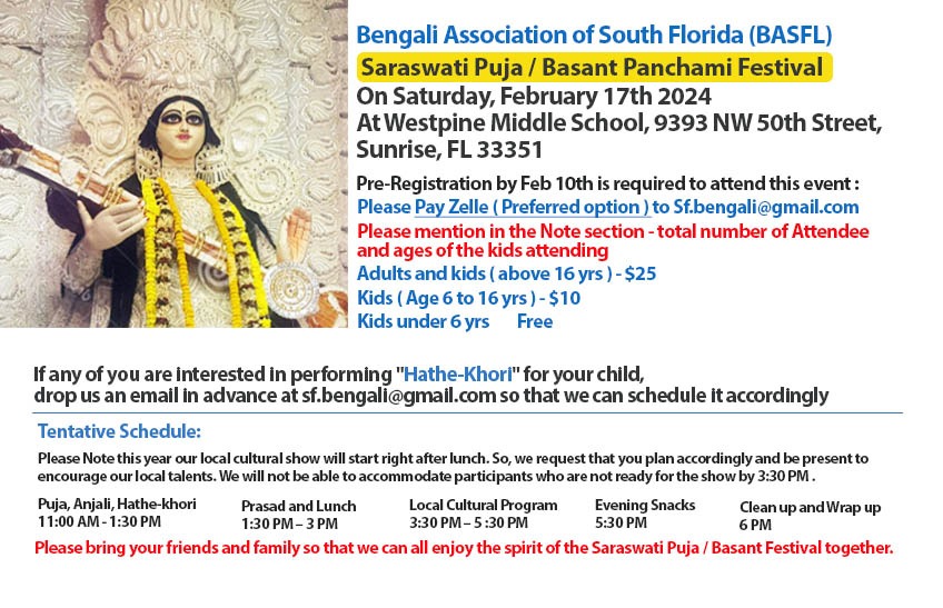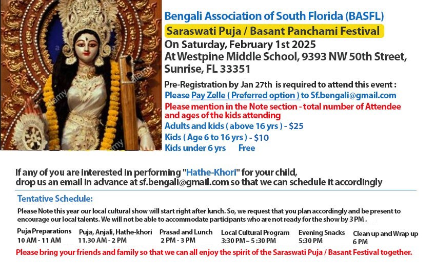 Bengali Association of South Florida (BASFL) will celebrate Saraswati Puja / Basant Festival on Saturday, February 1st 2025 at Westpine Middle School, 9393 NW 50th Street, Sunrise, FL 33351. Pre-Registration by Jan 27th is required to attend this event :